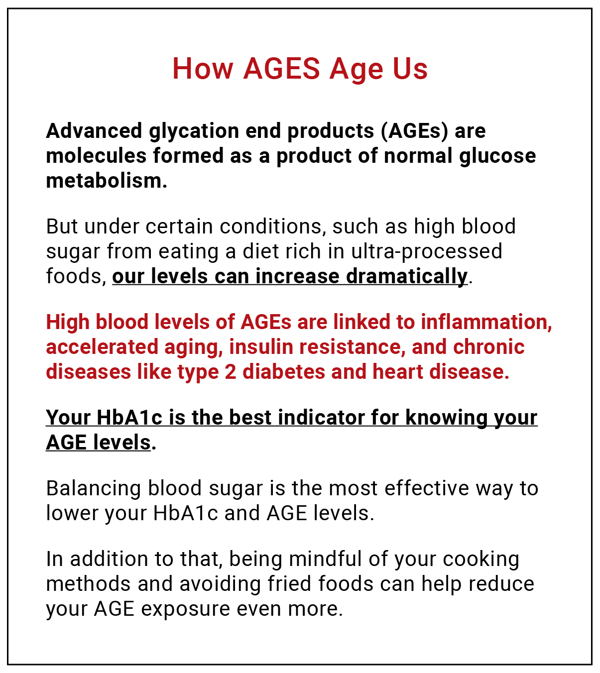 Lowering our HbA1c and our exposure to AGEs can help decelerate the aging process and protect us from chronic disease. The best part is it’s mostly in our control. Balancing blood sugar and cutting back on ultra-processed foods can help bring HbA1c (and AGEs) down to a healthy range.
