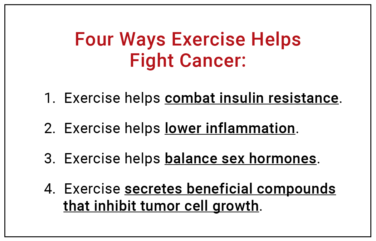 How exercise helps: Myokines have positive metabolic and physiological effects, which research shows can inhibit cancer development and progression by directly inhibiting tumor cell growth or beneficially altering the environment (for us, not cancer!) that cancer cells need to grow by lowering insulin and inflammation and supporting immunity.