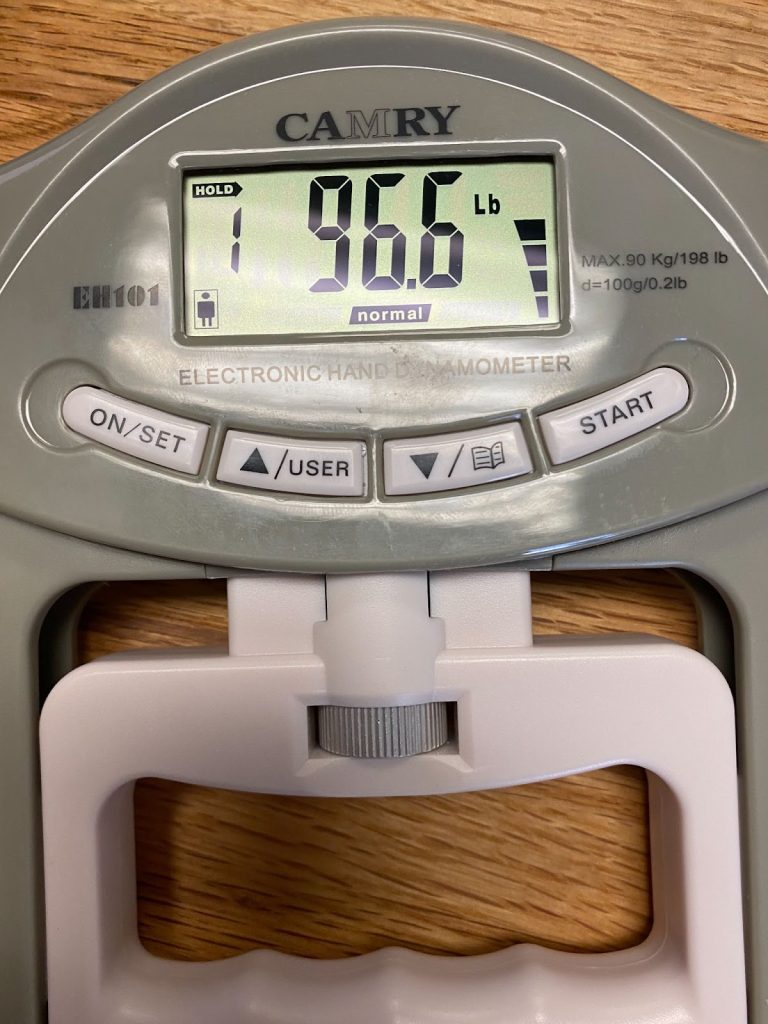 4. Measure your grip strength at home. You can order an electric handheld dynamometer to measure your own grip strength at home. Here’s one I tested out on Amazon. I like it because it will tell you whether your measurement is strong, weak, or normal based on age and gender. I tested my grip strength using the dynamometer above, and the results were super interesting. Here are my results and some notes from my experience: