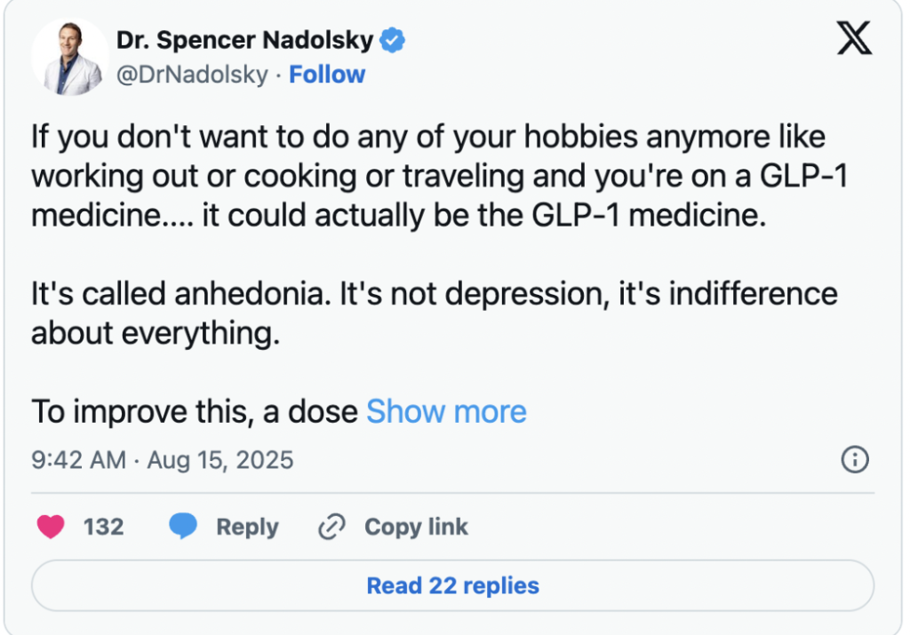 I have some family friends who are currently taking GLP-1 and have experienced some changes in personality, including feeling grumpy, anxious, and even depressed. Look, this is all anecdotal, and I cannot say for sure the medication is causing these challenges, but after seeing this tweet from Dr. Spencer Nadolsky, I’m a little more convinced that these folks could be experiencing GLP-1drug-induced anhedonia.