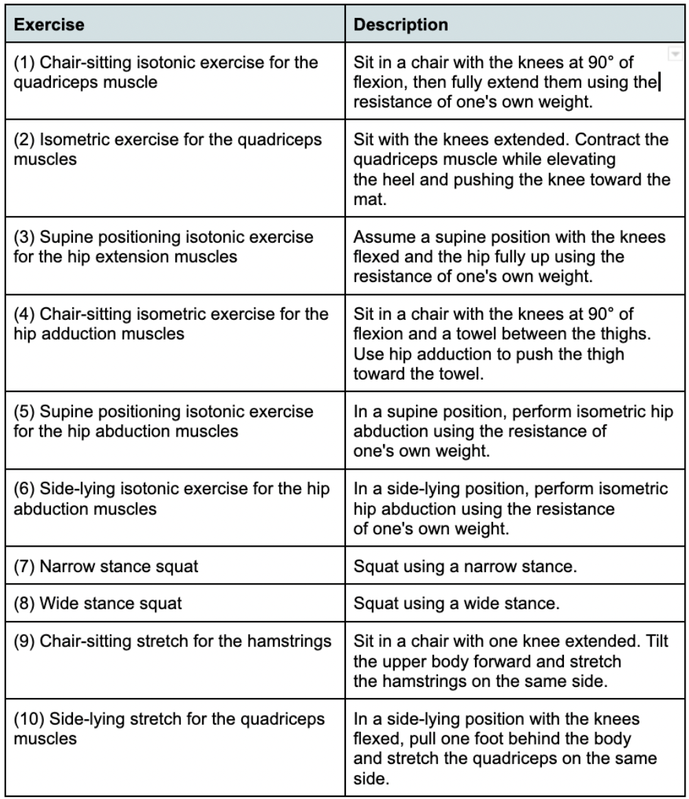 In the multiple-exercise group, physical therapists selected three exercises for each participant (see my Try This protocol below for the complete list of exercises); the control group followed a single chair-sitting exercise for their quadriceps muscles.