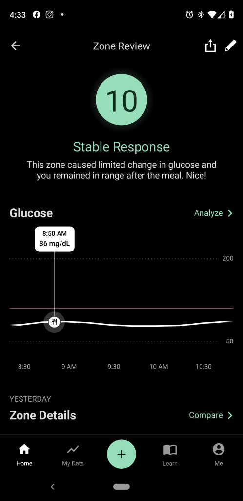 I also included pictures of the finished product (in traditional smoothie fashion and smoothie bowl form) and screenshots of Taylor’s and my zone scores for each recipe straight from the Levels app. A zone score of “10” indicates an optimal blood glucose response (I’ll give you a hint: they all received a perfect “10”).